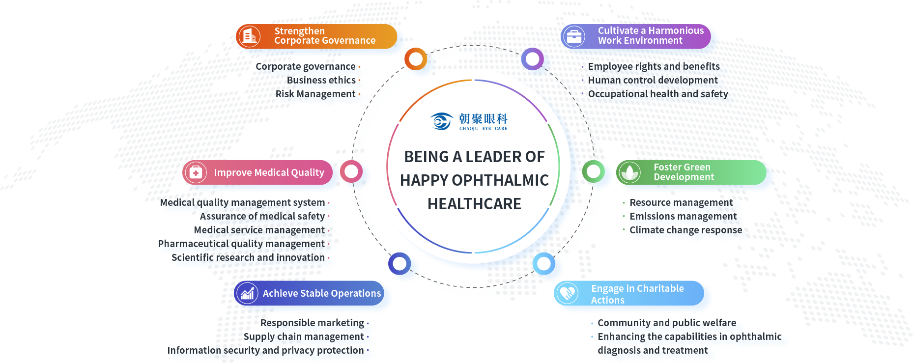 Adhering to the vision of “Being a Leader of Happy Ophthalmic Healthcare”, the Group continued to focus on development and value growth in the ophthalmology sector, identified six key areas related to our own operational development. Moreover, we have established and executed the ESG strategies for the high-quality development of the Group.